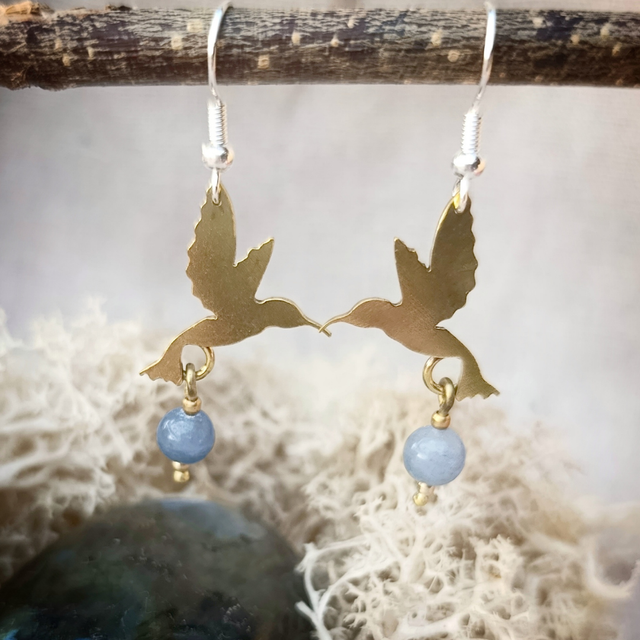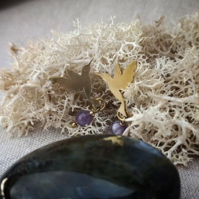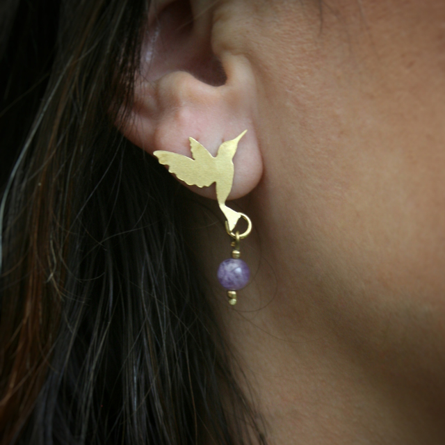 Les boucles d’oreilles représentent un colibri pour symboliser Coatlícue , la déesse aztèque. Le tout a été créé à partir de plaques et de tiges en laiton. Je les ai sciées, forgées, brasées... Pour une jolie finition le bijou a été poli.