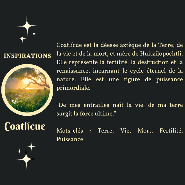 Ce talisman rappelle ce que représente Coatlícue représente : la fertilité, la destruction et la renaissance, incarnant le cycle éternel de la nature. Elle est une figure de puissance primordiale.