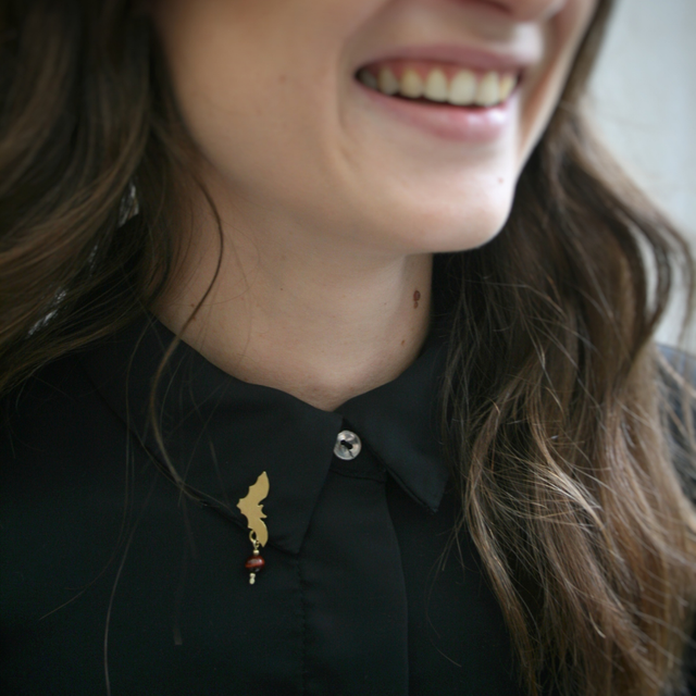 Le pin’s représente une chauve-souris pour symboliser Mélusine, une figure du folklore européen. Le tout a été créé à partir de plaques et de tiges en laiton. Je les ai sciées, forgées, brasées... Pour une jolie finition le bijou a été poli.