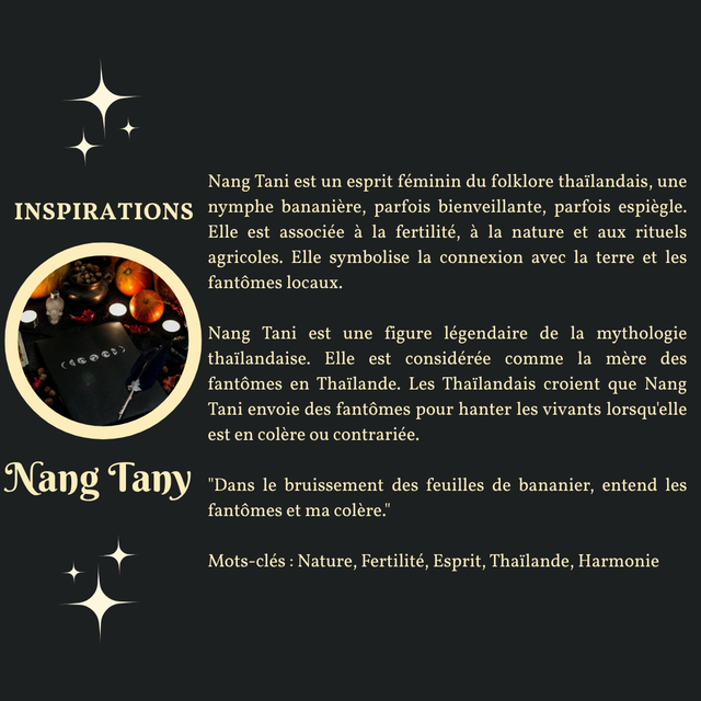 Ce talisman rappelle ce que représente Nang Tani incarne : la fertilité, la nature et l’agriculture. Elle symbolise la connexion avec la terre et les fantômes locaux.
