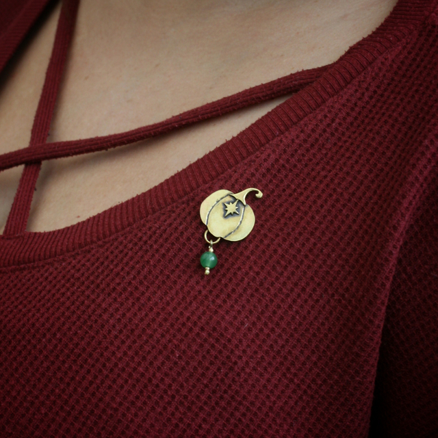 Le pin’s représente une citrouille pour symboliser Sally, l’héroïne de « The Night Before Christmas ». Le tout a été créé à partir de plaques et de tiges en laiton. Je les ai sciées, forgées, brasées... Pour une jolie finition le bijou a été poli et patiné. Et pour un meilleur maintien, il y a deux attaches par pin’s.
