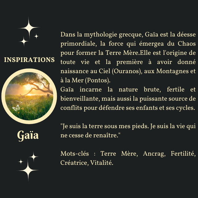 Ce talisman rappelle ce que représente Gaïa incarne : incarne la nature brute, fertile et bienveillante, mais aussi la puissante source de conflits pour défendre ses enfants et ses cycles.