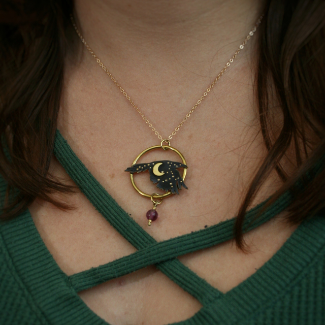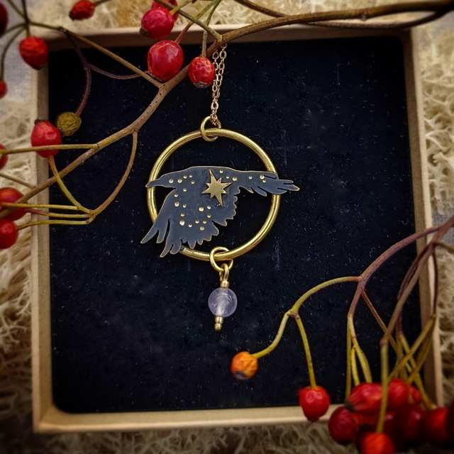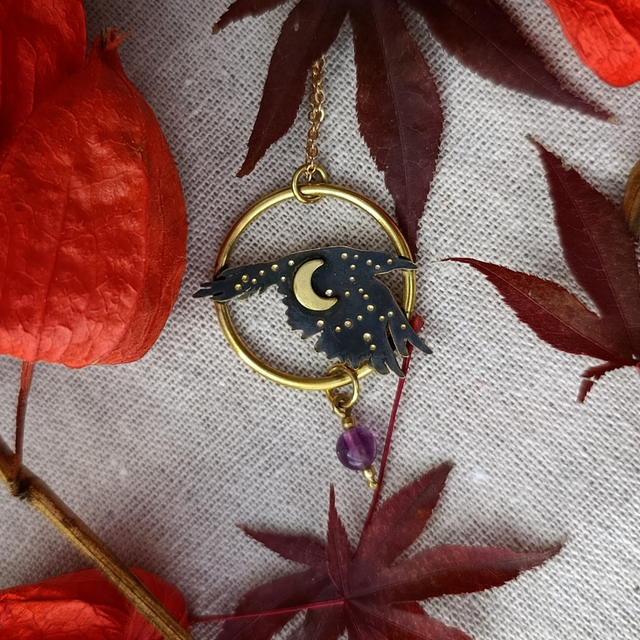 Ce pendentif représente un corbeau symbole de la Morrigan. Le tout a été créé à partir de plaques et de tiges en laiton. Je les ai sciées, forgées, brasées... Pour une jolie finition, j’ai oxydé l’oiseau pour le rendre noir et creusé des étoiles au foret. Seule la chaîne a été achetée.