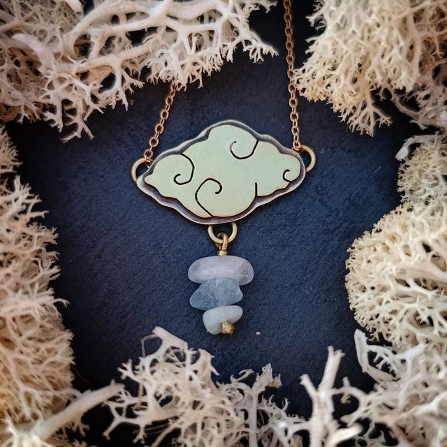 Le collier représente un nuage pour symboliser Tefnout, la déesse égyptienne. Le pendentif été créé à partir de plaques et de tiges en laiton. Je les ai sciées, forgées, brasées... Pour une jolie finition, j'ai poli le nuage et j'ai oxydé les creux pour qu’ils ressortent.