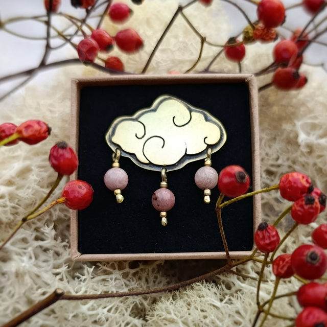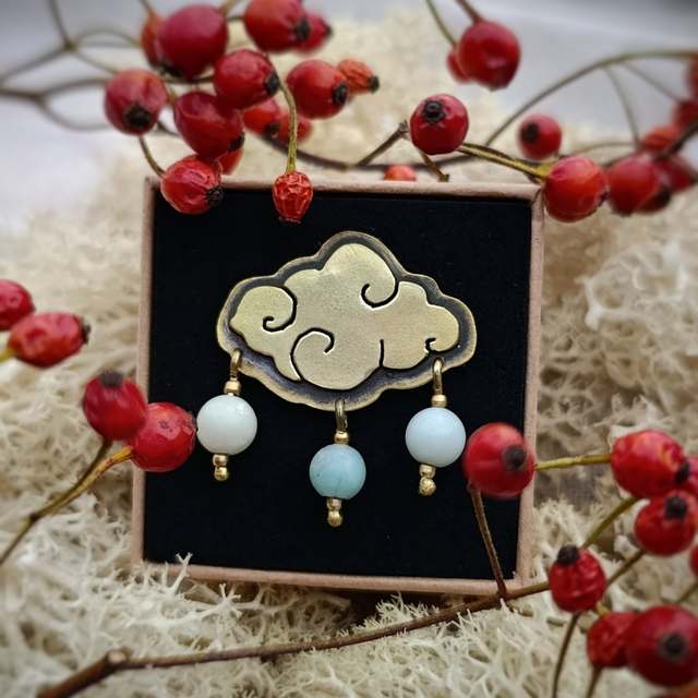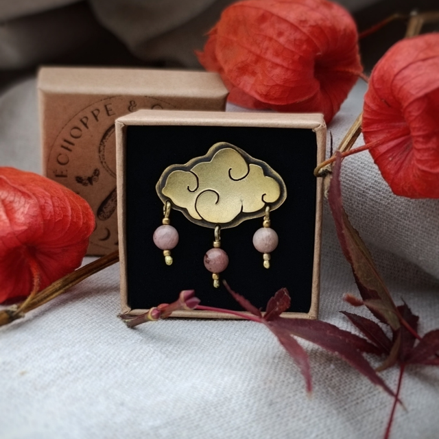 Le pin’s représente un nuage pour symboliser Tefnout, divinité Egyptienne. Le tout a été créé à partir de plaques et de tiges en laiton. Je les ai sciées, forgées, brasées... Pour une jolie finition le bijou a été poli. Et pour un meilleur maintien, il y a deux attaches par pin’s.
